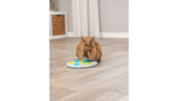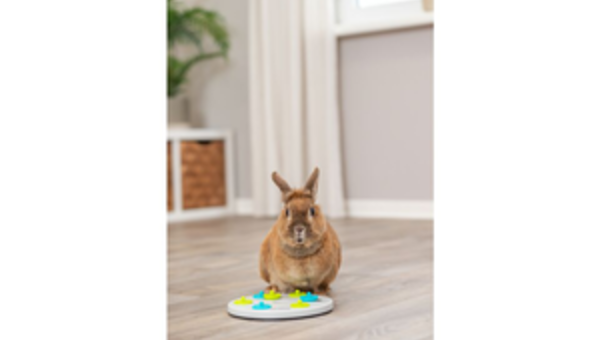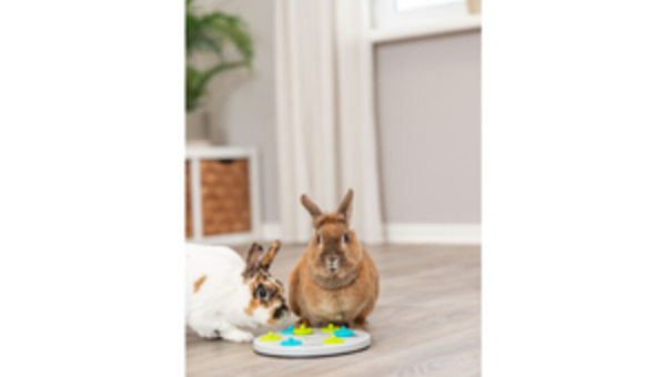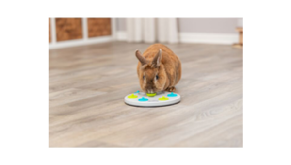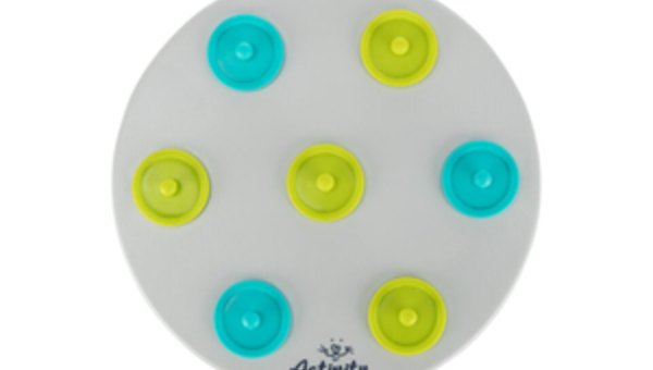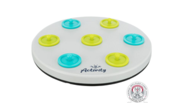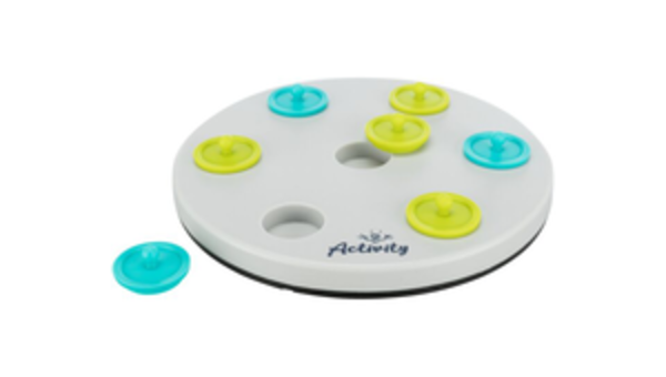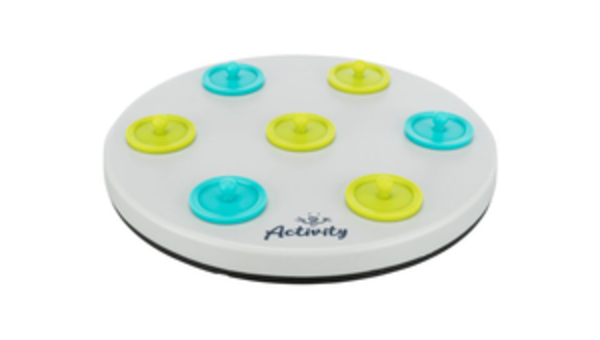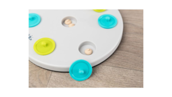 Spielbrett mit 7 Deckeln: durch Anheben der Deckel gelangt das Tier an seine Belohnung